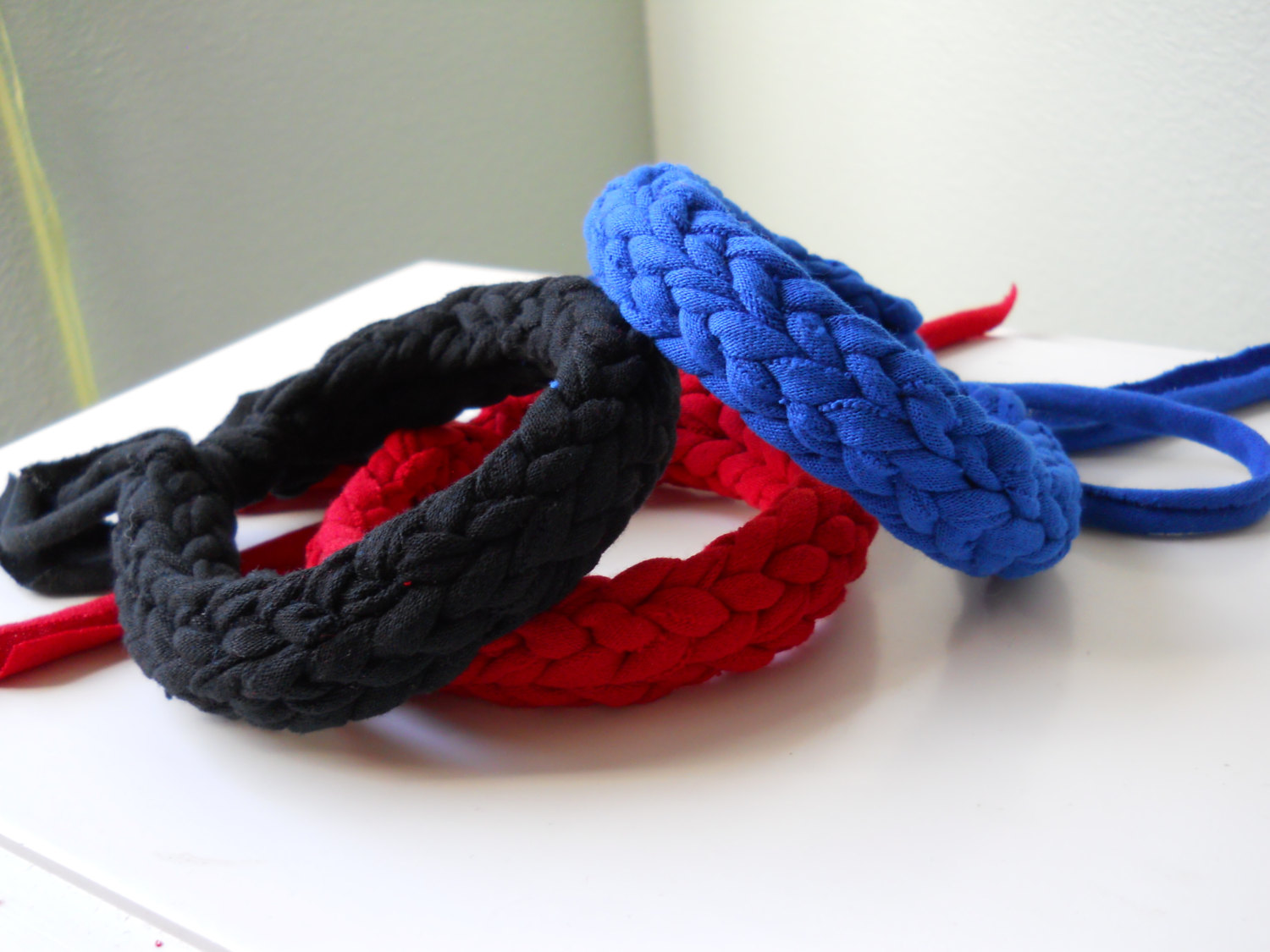 Each bracelet is handmade, by me using t-shirt yarn. These bracelets are adjustable and can easily slip on or be tied. The type of fabric used to make them does give them some stretch! And the best part? If you're allergic to most jewelry this is the right piece for you, there is absolutely zero metal in or on them.
